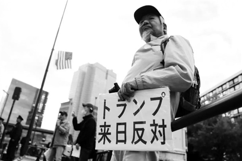 2025年10月28日,在日本东京的首相官邸外,示威者手举标语抗议,表达对美国总统特朗普访日的强烈不满,反对日美强化军事同盟破坏地区稳定。新华社发