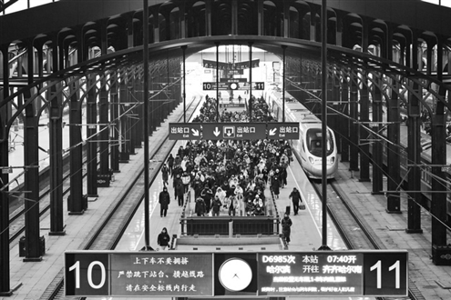 2026年春运2月2日启动,到3月13日结束。图为旅客在哈尔滨火车站乘车出行。新华社发