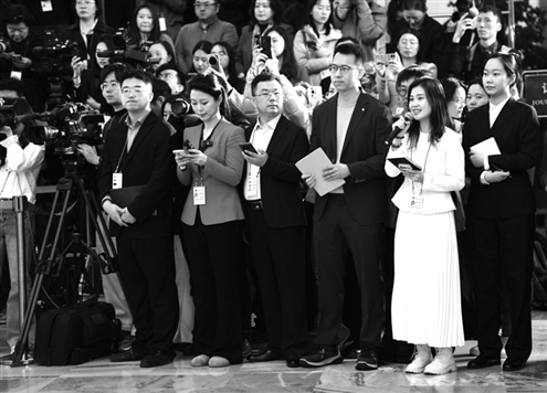 3月12日,第十四届全国人民代表大会第四次会议第三场“代表通道”集中采访活动在北京人民大会堂举行。这是记者在现场提问。新华社发
