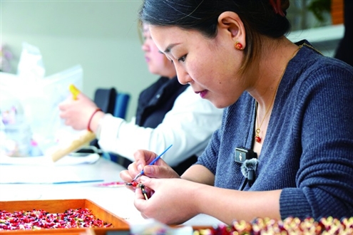 张淑凤正在进行珐琅首饰的绘制