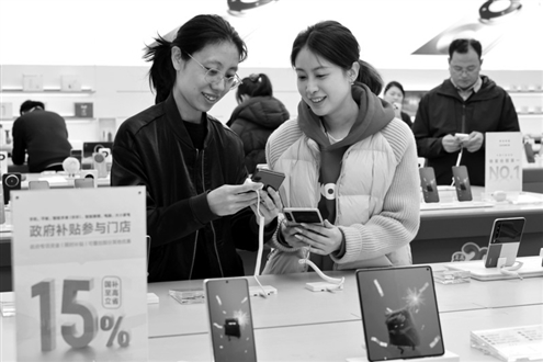 消费者在枣庄市一家手机专卖店选购手机。新华社发