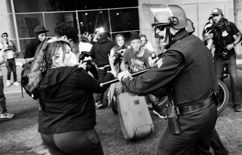 美国多地3月28日爆发示威抗议活动。数百万民众走上街头,呼吁结束对伊朗的军事打击。图为当日,在加利福尼亚州洛杉矶,一名抗议者与执法人员对峙。本版图片均由新华社发