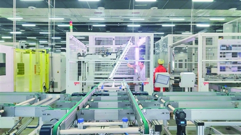 除智慧供热外,光伏产业正成为起步区绿色发展重要增长极。在孙耿街道爱旭济南高效晶硅太阳能电池组件项目现场,1.5公里自动化生产线高速运转,作为山东首个10GW级BC光伏制造项目生产基地,日产能可达1.2万—1.5万块电池板。基地通过“绿色能源替代、资源循环利用、智能制造赋能”三条主线,系统推进零碳工厂与零碳园区建设。