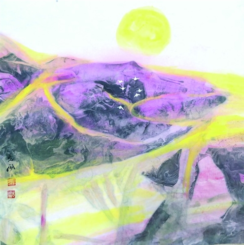 在技法创新层面,赵先闻独创的“染拓手法”将中国画传统的泼墨泼彩与现代工艺美术的纹理技法融为一体,通过水墨与色彩在纸面上的自然渗化与凝聚,营造出瑰丽的视觉幻境。这种“非笔墨却胜似笔墨”的艺术效果,在《明月皎皎》中体现得尤为精妙:画面回旋的飞动条纹与淡蓝月晕形成时空对话,青黑怪石的静默伫立深蕴着天人合一的天机。如《圣境》中朱砂与石青的强烈碰撞,恰似黄河口湿地的红柳与碧水在幻境中的重构。细察其作,染拓之间,既有西方现代构成的空间意识,又不失中国画“计白当黑”的虚实智慧,两种美学体系在纸面上达成微妙的平衡,生发出独特的视觉韵律。