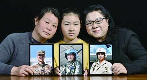 王伟的妻子阮国琴(右)、张超的女儿张上明珠(中)、肖思远的母亲刘利霞手捧烈士照片合影(2026年1月4日摄)。