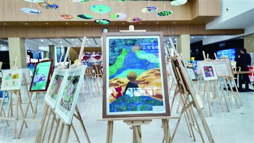 在济南市图书馆一楼大厅,驻足望去,一排排画作缤纷耀眼,每一笔都是他们内心世界的真实倾诉;抬头仰望,悬挂的伞面宛如空中花园,承载着他们纯粹的灵魂独白。灵动的线条与绚烂的色彩交织,尽显孩子们独特的艺术天赋与丰盈的内心世界。