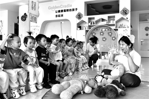 去年7月22日,在滨州市博兴县金色摇篮幼儿园,老师带托育班的孩子做游戏。新华社发
