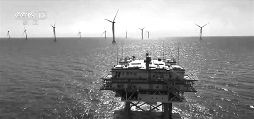 中国华能7日宣布,位于黄海北部的山东半岛北海上风电项目当天全容量并网发电。央视截图