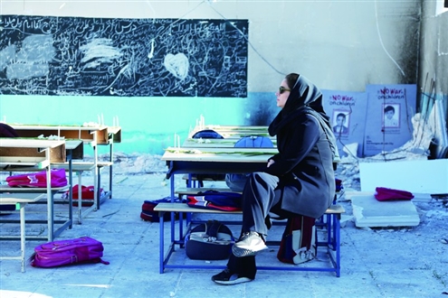4月6日,在伊朗首都德黑兰,一名妇女坐在小学教室遭袭的场景内,悼念遭美以空袭遇难的米纳卜小学学生。新华社发