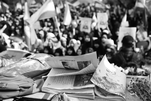 4月7日,在伊朗首都德黑兰,学生书包和课本摆放在集会现场,悼念遭美以空袭遇难的米纳卜小学学生。新华社发