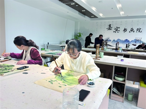四楼“嘉宾书画院”一进门就墨香四溢,凤凰街道的谢阿姨笑着说:“学画已有七八年了,以前要奔波去其他画院,现在家门口就能学,太方便了!”这里实现了文化服务零距离,也让传统文化在笔尖绽放。
