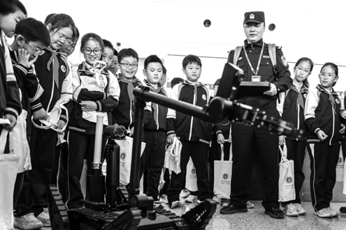 4月15日是全民国家安全教育日,济南边检站联合济南市国家保密局、山东省公安厅机场公安局、济南国际机场,在出入境现场开展“国门一线共上国家安全教育课”主题宣传活动。山东师范大学第二附属中学50名师生代表走进边检一线接受沉浸式教育,提高国家安全意识。图为13日,在济南国际机场,学生在活动现场观摩警用装备。
