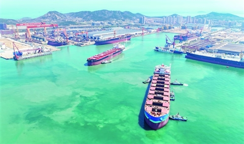 4月13日,中国船舶集团青岛北海造船有限公司生产现场一派繁忙。一艘21万吨绿色燃料船舶在办完手续后,出海试航。据了解,北海造船目前在建船舶25艘,手持订单达90余艘,其中绿色燃料船舶占比超九成,部分船舶交船期已排至2030年。