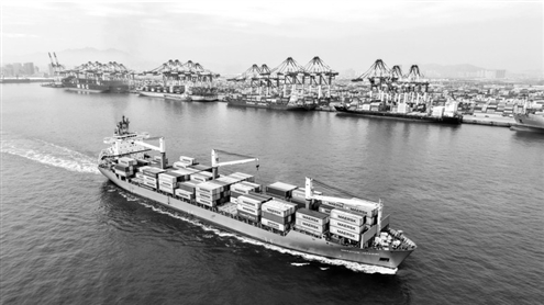 我省进出口实现平稳开局。图为4月14日在山东港口青岛港,装载外贸集装箱的货轮驶离港口。新华社发