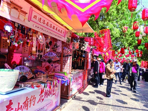 沿着主山路拾级而上,百余个摊位蜿蜒如龙,地方特产、手工艺品和风味小吃应有尽有,满足了游客的味蕾与购物需求。薄脆的周村烧饼、油亮的黄家烤肉、醇香的泉水茶汤等省内外特色美食汇聚一堂,特产百货、林果山货琳琅满目,更有吹糖人、糖画等非遗手作现场展演,让人流连忘返。
