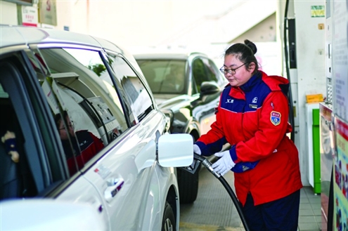 工作人员在江苏省昆山市一加油站给汽车加油。新华社发