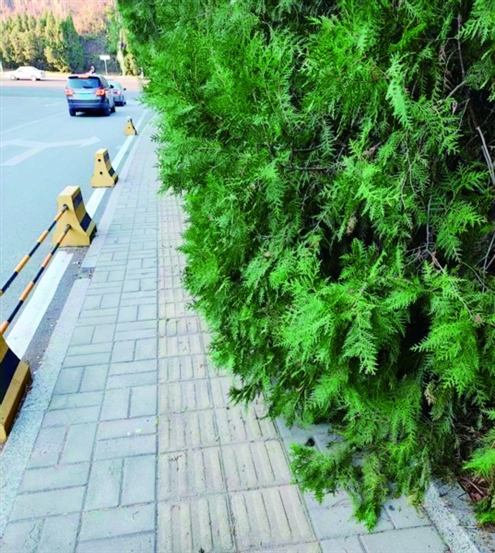 侧柏枝叶侵入道路空间,遮挡交通视线,给来往市民出行造成隐患