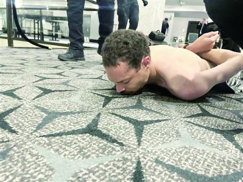 特朗普在社交媒体上发布的一张照片显示,一名男子赤裸上身,脸朝下趴在酒店地上,疑为被制服的枪手。
